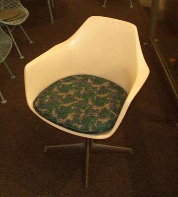 In the manner of Eames, white fiberglass shell on a cast aluminum base, period patterned fabric slip seat, molded mark, h: 32 in.