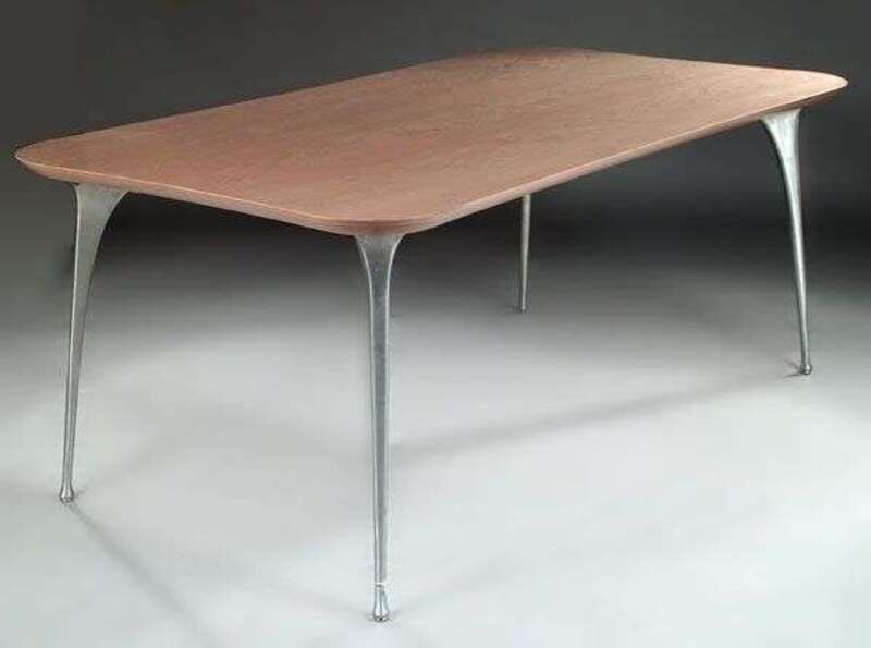 The top of basic rectangular form with rounded corners and sides in a multiple-layered laminated wood, resting upon four cast aluminum tapered legs, h: 29, l: 70, w: 40 in.