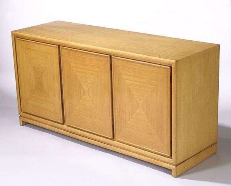 Rectangular case in bleached mahogany with three veneered doors, one enclosing adjustable shelves, the others a series of drawers, on a simple bracket base, partial label, h: 31, w: 62, d: 20 in.