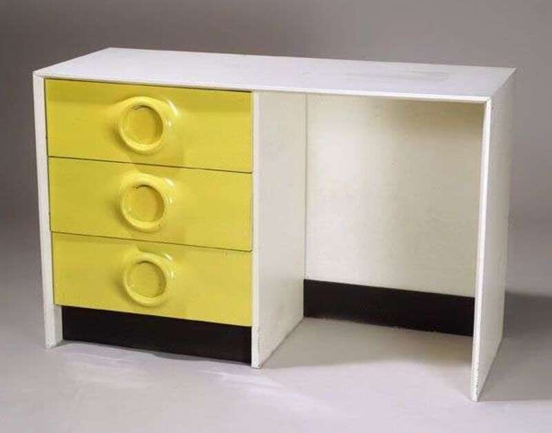 White laminate top and sides, three molded yellow plastic drawers, h: 30, w: 47 1/4, d: 19 in.