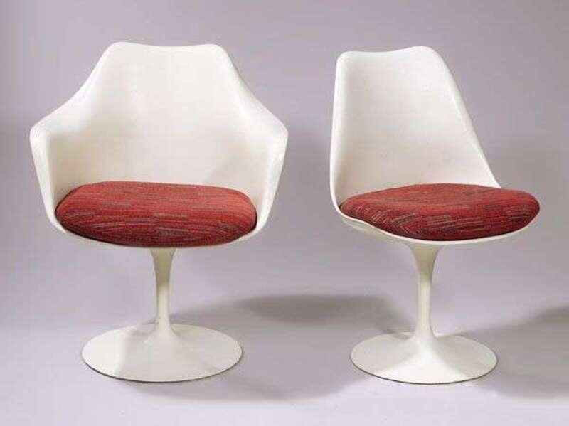 Designed 1956; two armchairs, two side, each in molded white fiberglass on an enameled white base, original red woven slip seats, Knoll International label, hts: 32 in.