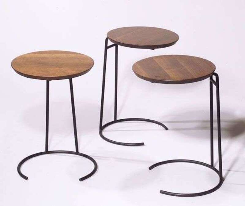 Each with circular mahogany top on blackened steel base, stickers, h: 20 1/2, dia: 14 in.