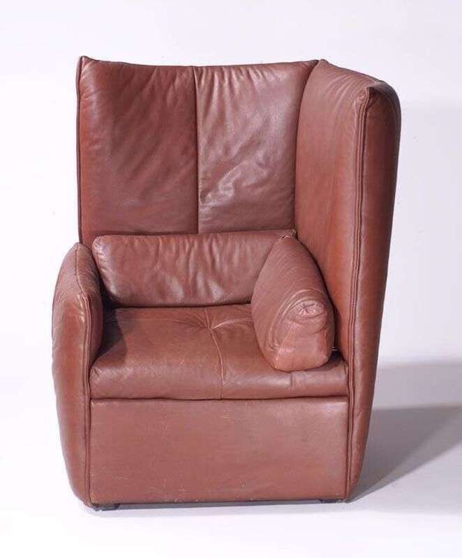 With tall upholstered back, seat and sides in brown leather, h: 42, w: 35, d: 35 in.