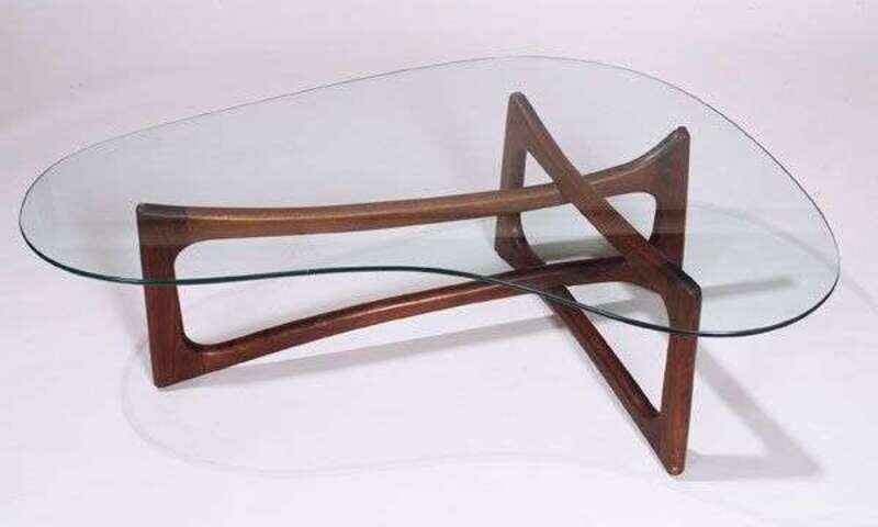 Base with conjoined teak frames supporting a free-form glass top, h: 15 1/2, l: 50 in.