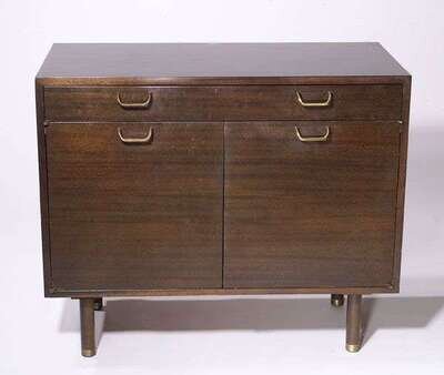 Simple ebonized wood case with black laminate surface, single long drawer above twin cabinet doors enclosing adjustable glass shelf and door compartments, on dowel legs with brass caps, h: 30, w: 36, d: 19 in.