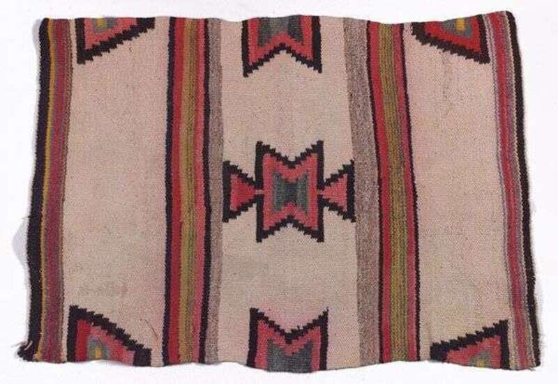 Red, pink yellow and black geometrics on ivory field, 3 ft. 4 in. x 2 ft. 3 in.