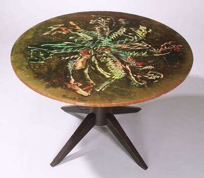 With circular top hand-painted and signed by Elizabeth Gross and lacquered; the turned base on four geometrically conceived legs, gold Dunbar label, paper tag, h: 26 1/2, dia: 39 1/2 in.