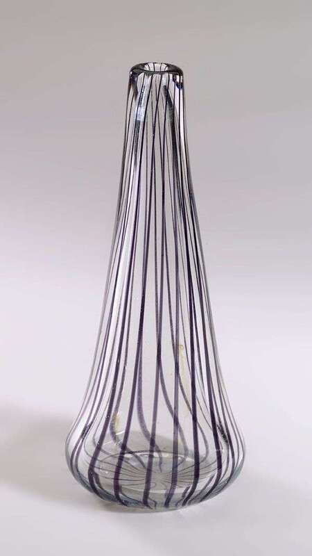 Flaring form with vertical amethyst stripe decoration, engraved "A. J. J. 53 Hadeland," h: 8 1/2 in.