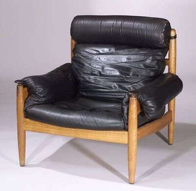 With heavy teak frame, bentwood back and black leather upholstered cushions, h: 33, w: 36, d: 33 in.