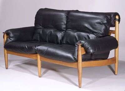 With heavy teak frame, bentwood back and black vinyl upholstered cushions, h: 33, w: 62, d: 33 in.