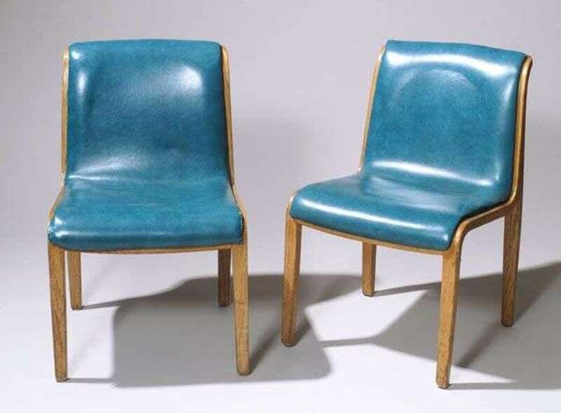 Each with bent oak frame and upholstered turquoise vinyl seat, needs reupholstering, Knoll International labels, h: 31, w: 19 1/2, d: 22 in.