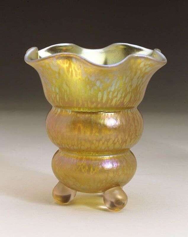 Lobed form with ruffled rim on three ball feet, "CZECHOSLOVAKIA" in oval stamped mark, minor scratches to interior, h: 5 in.