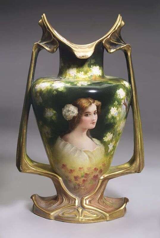 Hand-painted with portrait of a young woman, landscape to reverse, signed "T. Stichers," brown transfer mark, gilt wear to handles, h: 15 1/2 in.