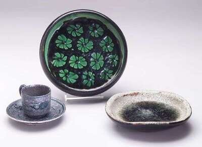 Three pieces, including black & green flower bowl signed "HAK Danmark," for Herman Kaehler; a small black and & green cup and saucer signed "FM," in triangle; and a thick volcanic dish, unsigned.