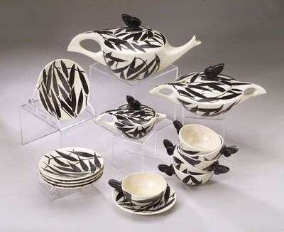 With eucalyptus leaf decoration in black on a white ground, handles and finials are black butterflies; a setting for six, including six cups & saucers, creamer, sugar dish, and tea pot; one saucer cracked, handle to sugar repaired.