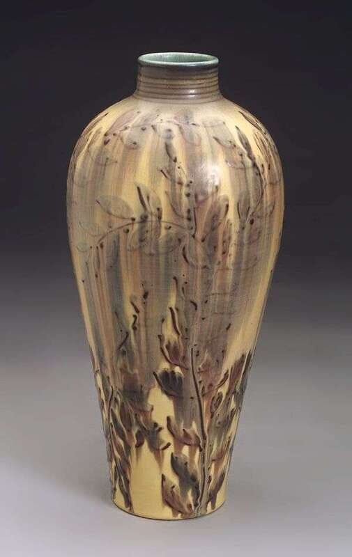 Of Chinese form, with brown and gray squeezebag foliage against a pale yellow ground, artist's cipher, and flame mark for 1927, h: 16 1/2 in.