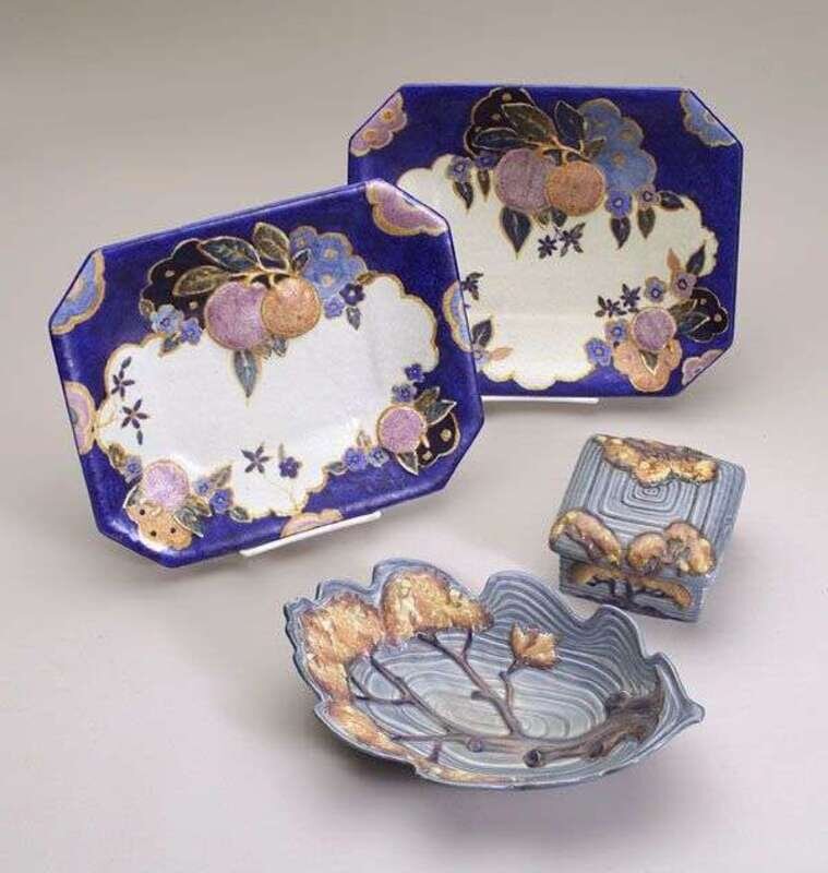 Five pieces, including two octagonal trays, each with embossed and painted fruit/ floral motifs, chip to underside of rim on both; a covered square box with embossed and painted oak trees on concentric square blue ground, few nicks; a dish of similar oak tree pattern in the shape of an oakleaf.