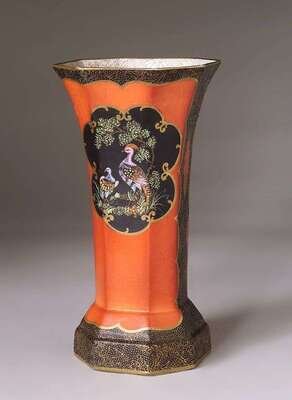 Of octagonal section with chinoiserie reserves in black against a red/organge ground, gilt wear to rim, h: 9 in.