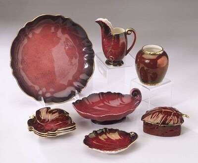 Nine pieces, all covered in deep red flambe glaze with gilt highlights; including a small vase, a cream pitcher, a leaf-covered box, three leaf dishes, a shell dish, a larger shell dish, and a scalloped-edge plate, stem to one leaf dish broken off.