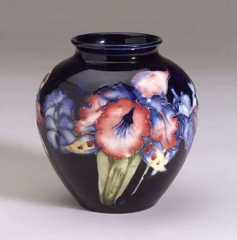 With hand-decorated flowers on a deep cobalt ground, paper label, h: 4 in.