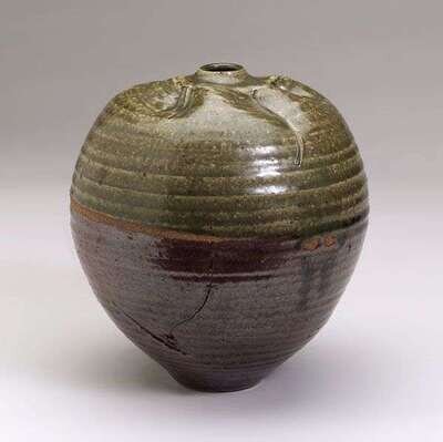 Hand-thrown with "crumpled" top, the bottom with an earthy brown glaze, top with an organic green glaze, hash mark signature, h: 8 in.