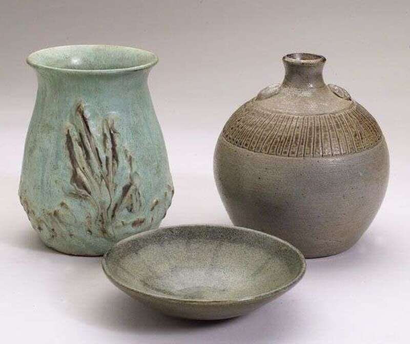 With salt glaze and brown highlights, circular mark, h: 7 in.; together with a studio pottery vase signed "KOSLOW," and a low bowl initialed "MHJ".