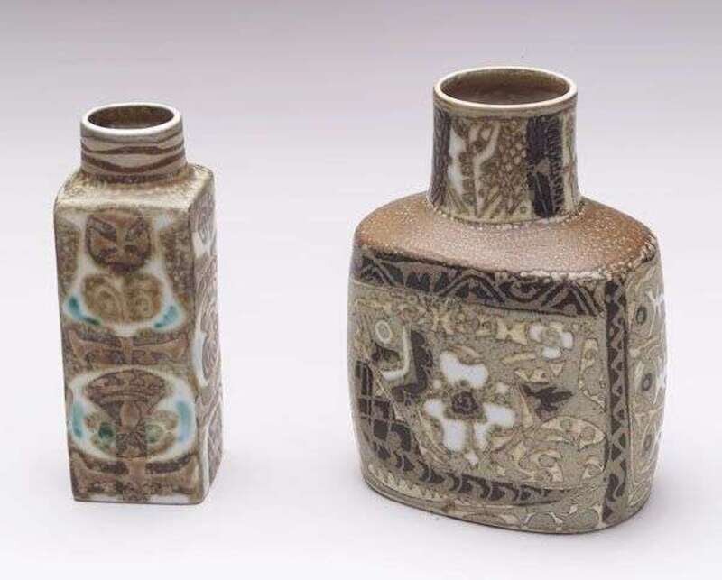 Each with squeezebag decoration in matte brown, the smaller abstract, the larger featuring stylized fish, various marks, hts: 4 3/4, 5 1/4 in.