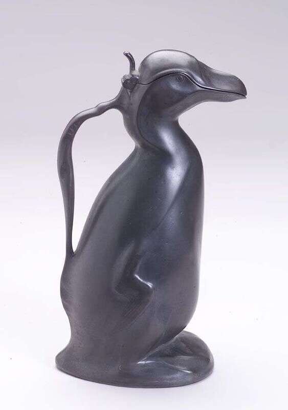 Of figural penguin form, stamped marks to base, ding to one side, h: 11 1/3 in.