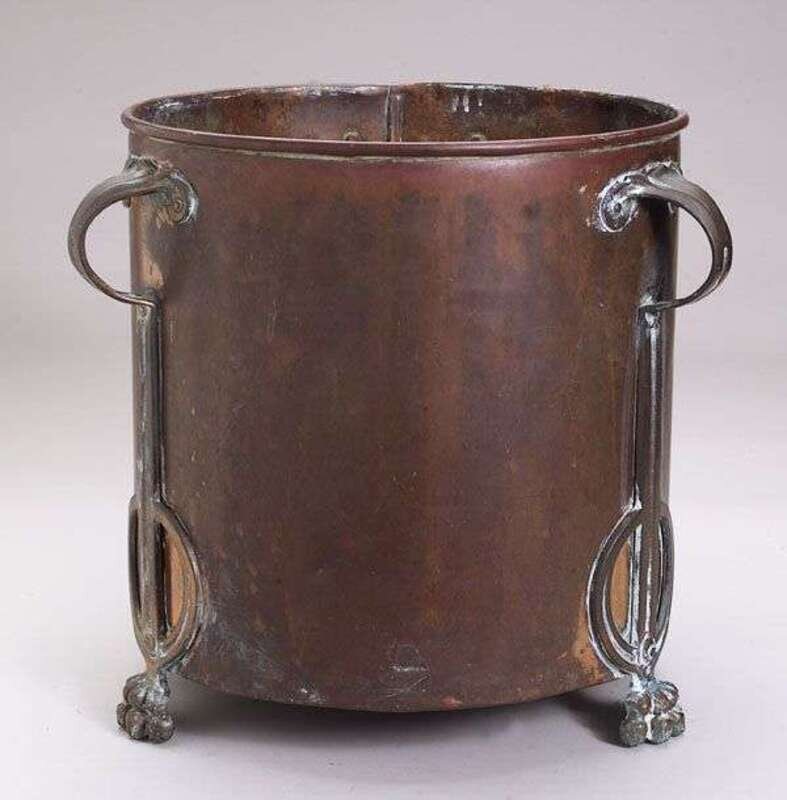 Cylindrical copper form riveted with three stylized cast handles and paw feet, stamped "Emantee" underneath, h: 12 7/8, dia: 12 1/2 in.