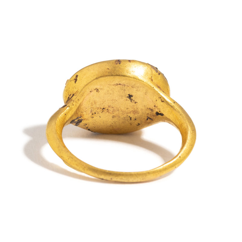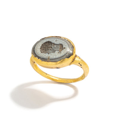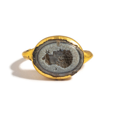 A Roman Gold and White Glass Finger Ring with a Male Portrait Head (Possibly a Young Hercules)