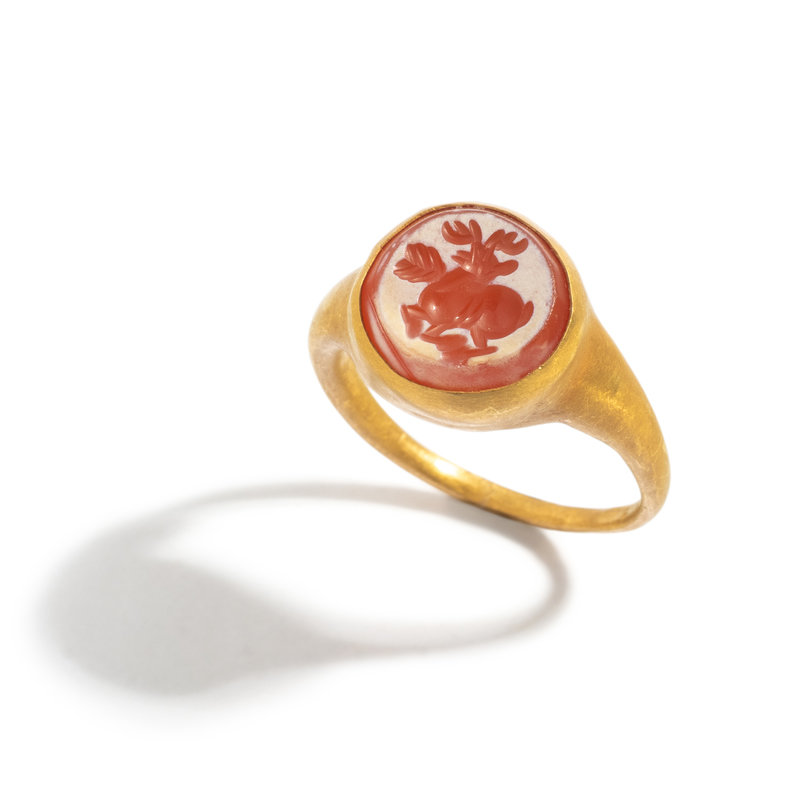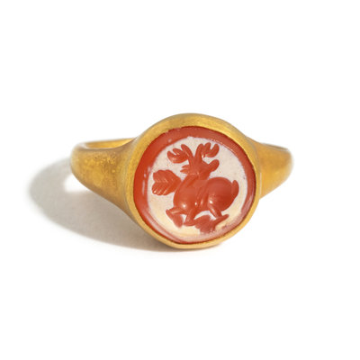 An Eastern Roman Gold and Carnelian Finger Ring with a Stag