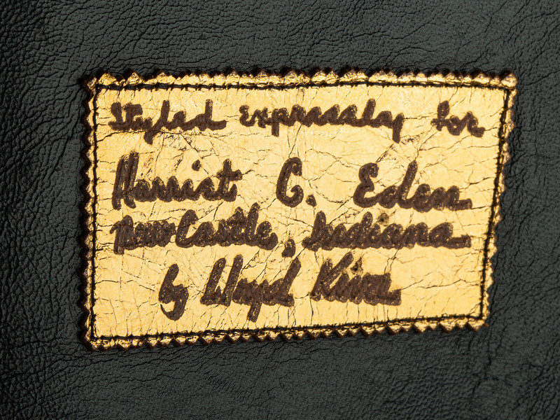 gold leather tag on interior reads STYLED EXPRESSLY FOR HARRIAT G. EDEN NEW CASTLE, INDIANA BY LLOYD KIVA