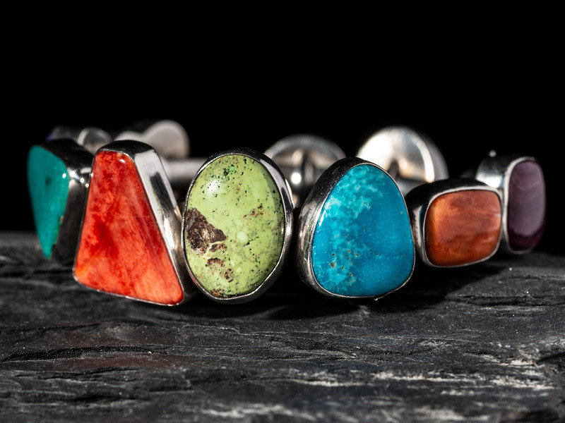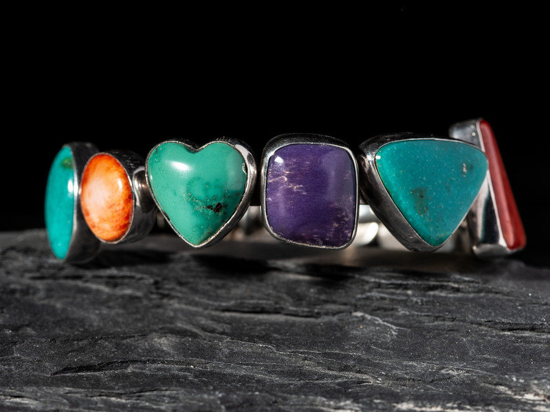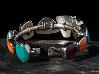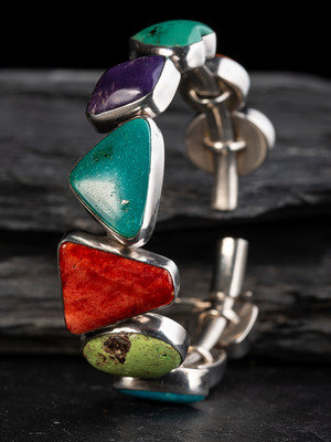 set with turquoise, spiny oyster, and sugilite in varying shapes; signed DEE NEZ and marked STERLING