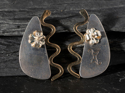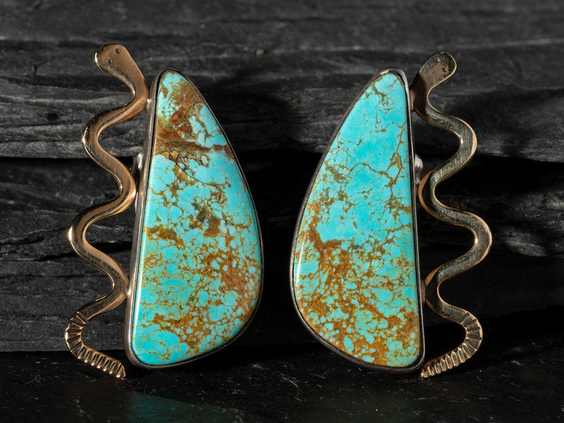 Silver and Turquoise Post Earrings, with 14K Gold Snake Accents