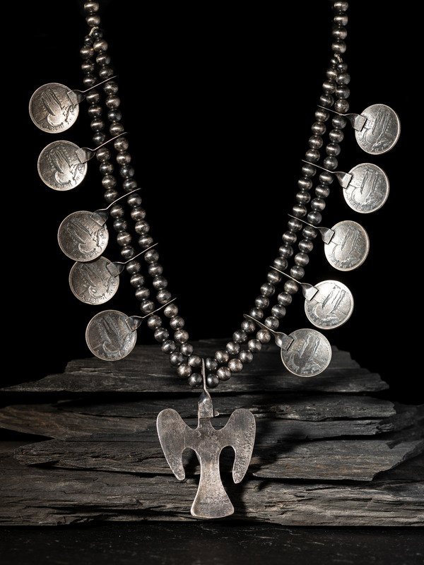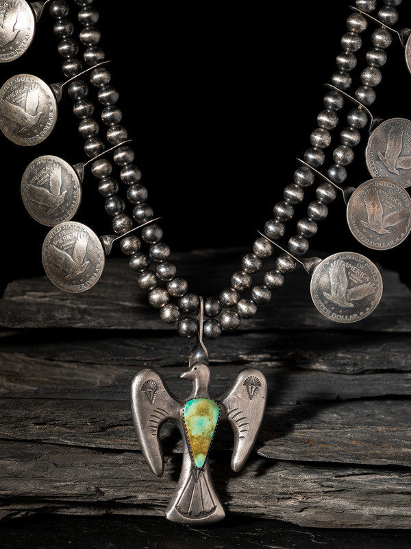 Taos Coin Silver Thunderbird Squash Blossom Necklace