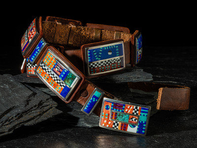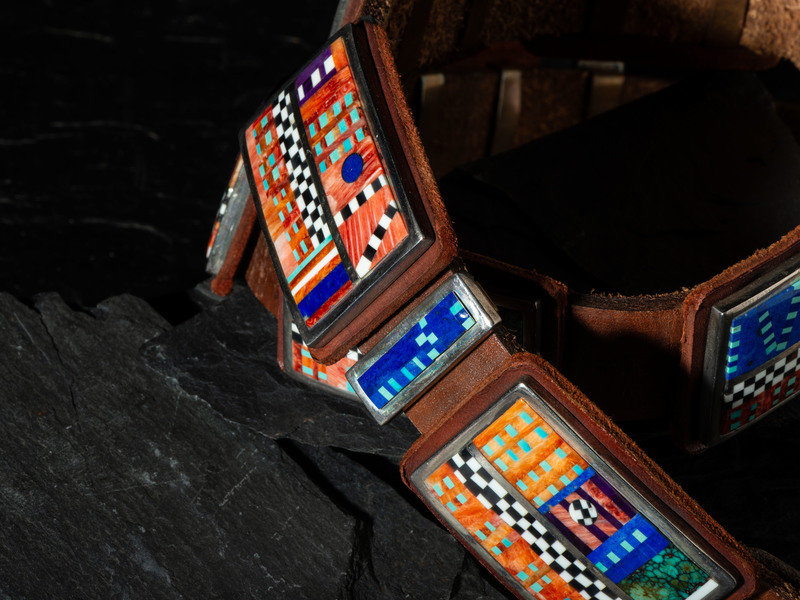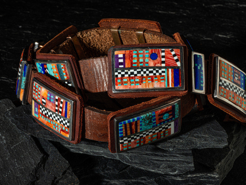 set with turquoise, spiny oyster, lapis, shell, jet, and sugilite; marked with artist's hallmark