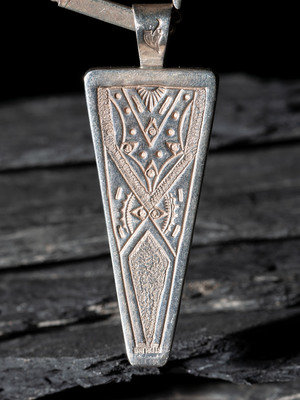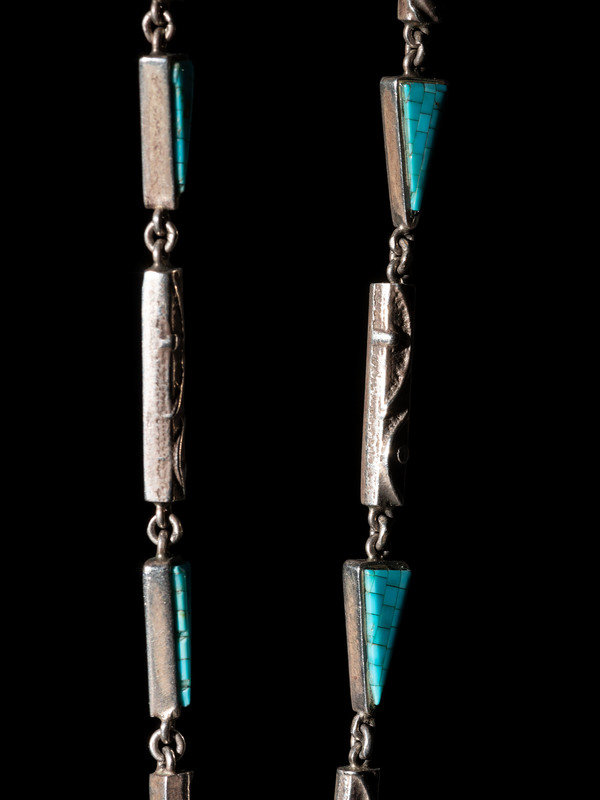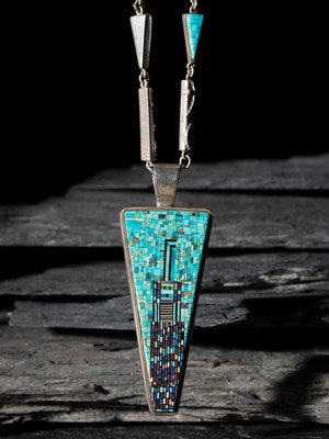 trapezoidal pendant set with turquoise, jet, coral, lapis, sugilite, and shell; accented by a chain comprising of tufa cast rectangular links and triangular links set with micro mosaic turquoise; marked with artist's hallmark on back of pendant