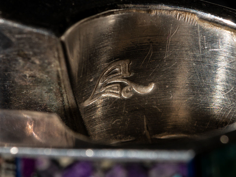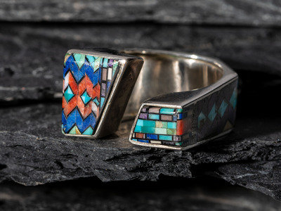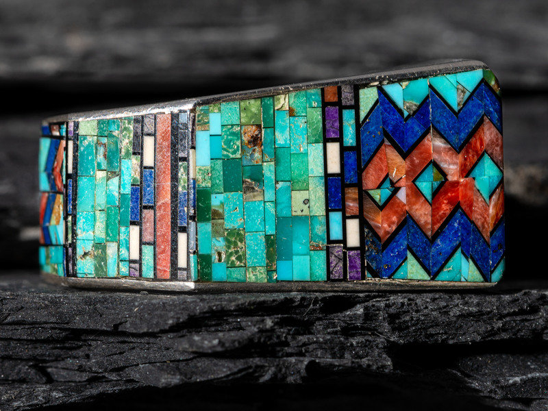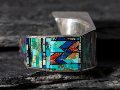 set with turquoise, lapis. spiny oyster, sugilite, and shell; marked STERLING along with artist's hallmark