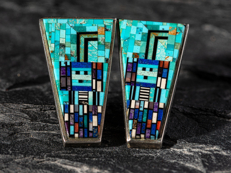 set with turquoise, lapis, sugilite, shell, and coral; heavily stamped on reverse with artist's hallmark incorporated in the design