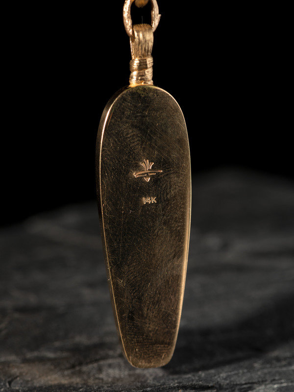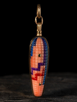 inlaid with pink and red coral, lapis, and sugilite; marked with artist's hallmark and 14K