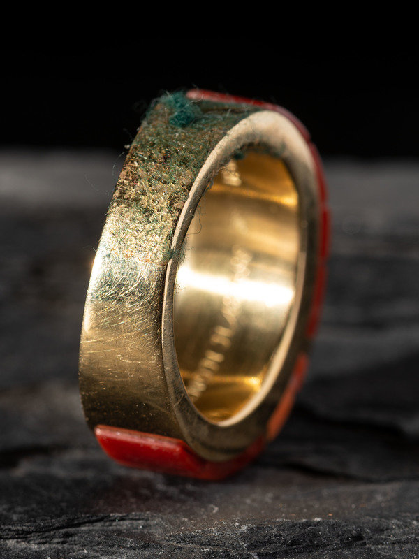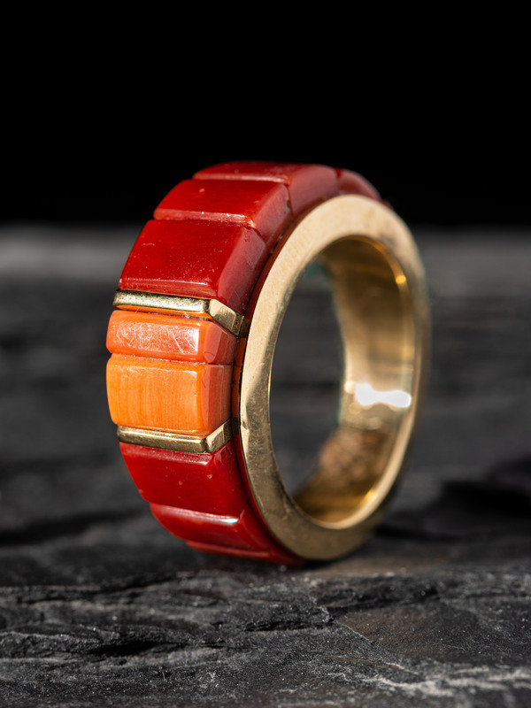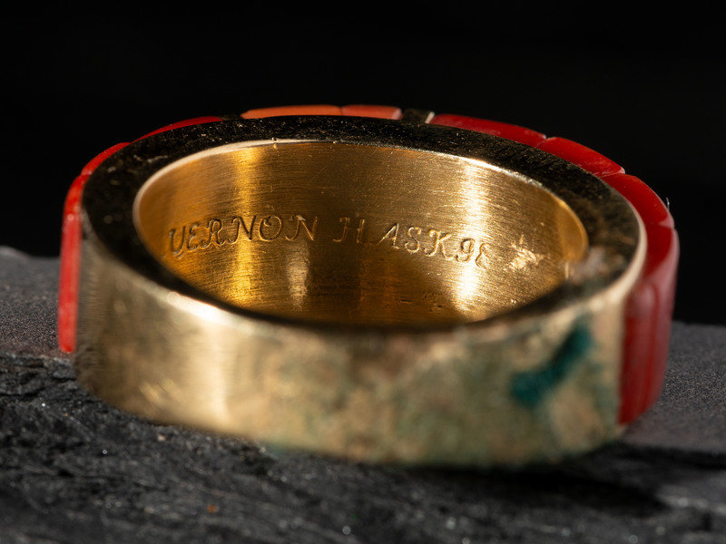 set with tapered cobblestone inlay of red and pink coral; signed VERNON HASKIE and marked 18k