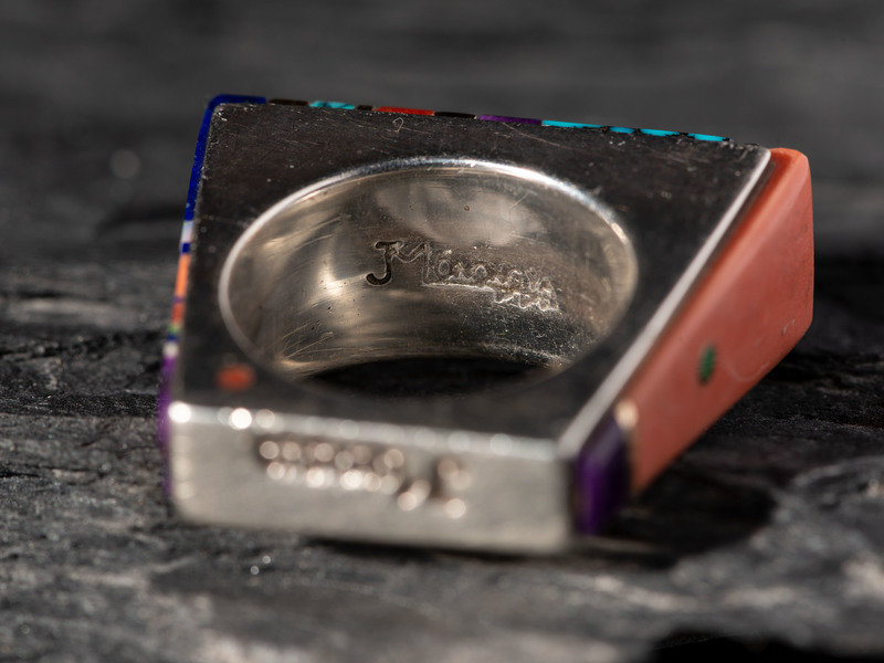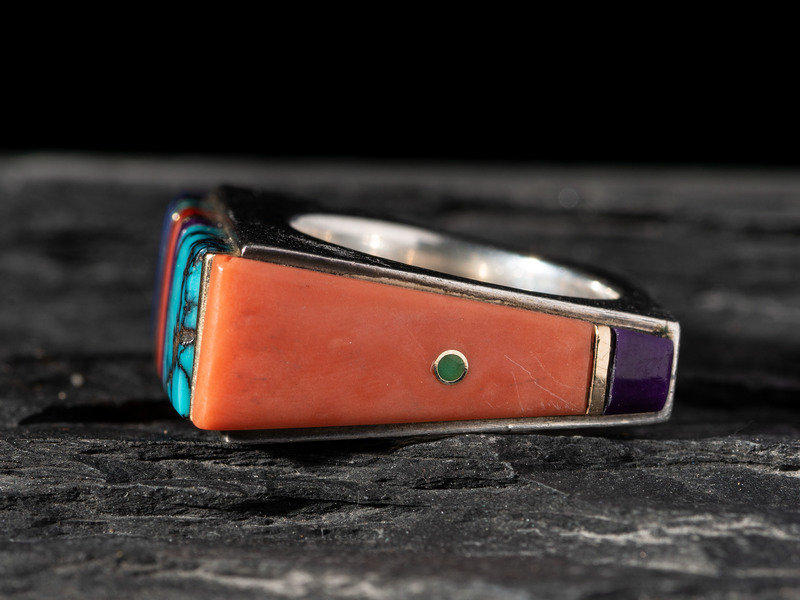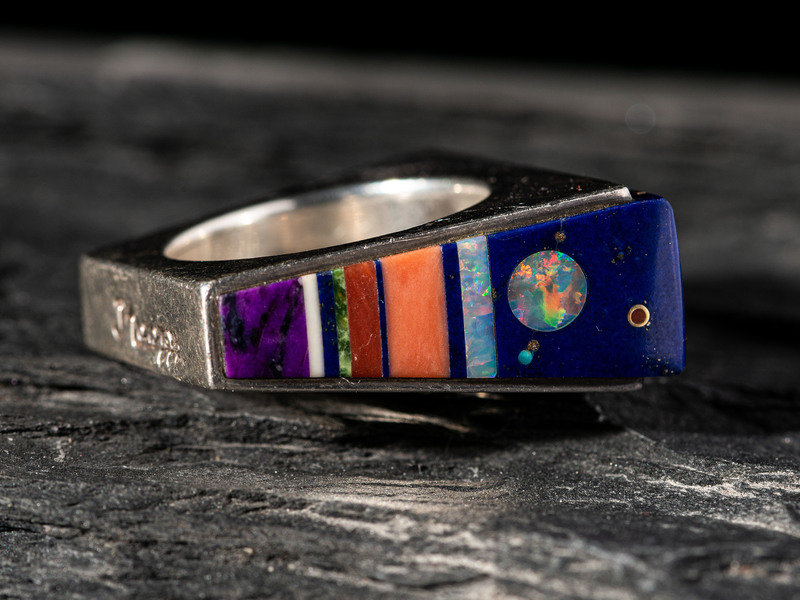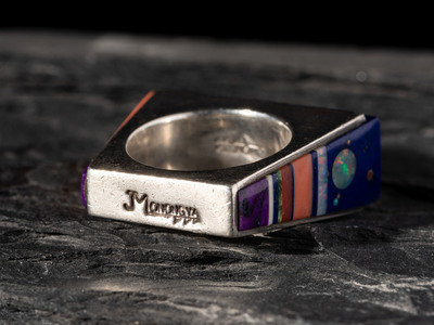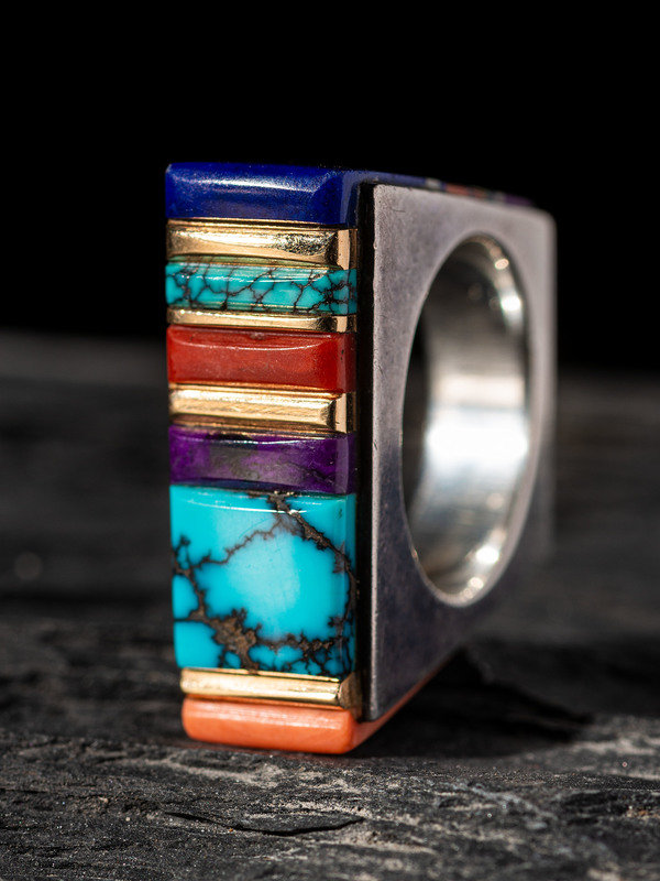 Silver Ring, set with Turquoise, Coral, Lapis, Sugilite, Opal, and 14K Gold Spacers