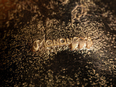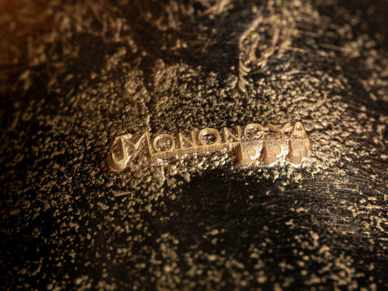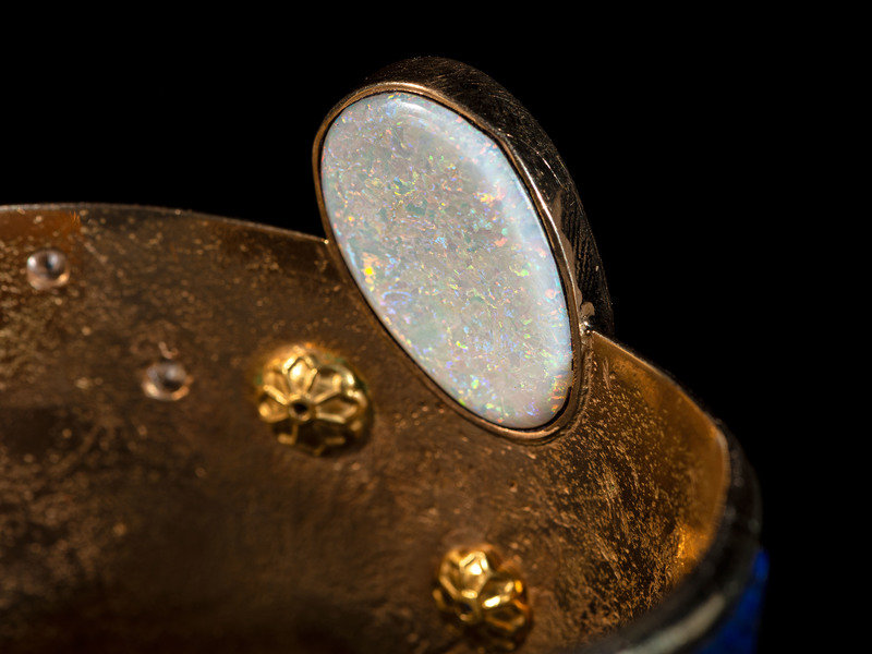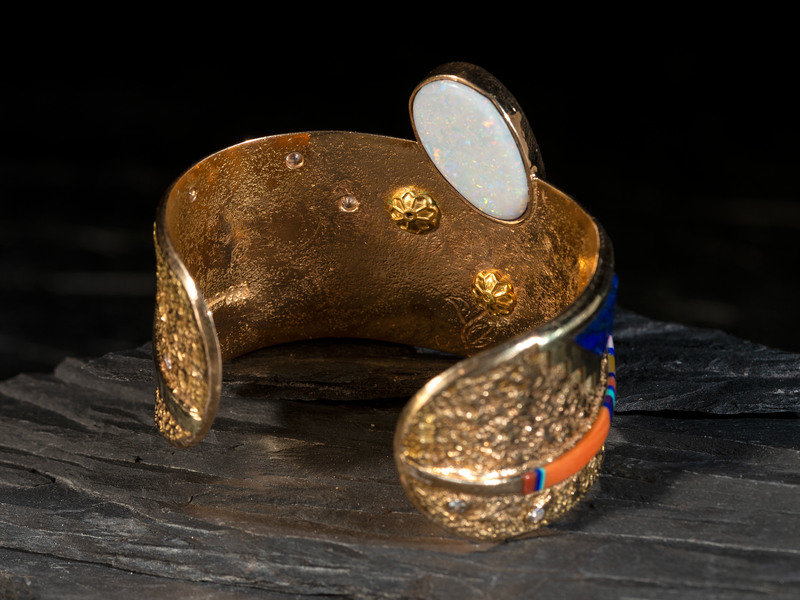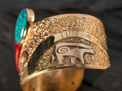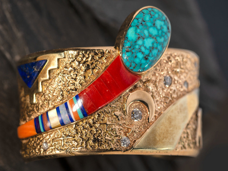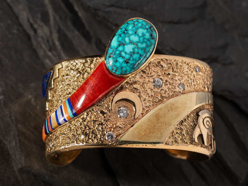 a tufa cast cuff featuring a bear with heartline and Avanyu against a night sky; the head of Avanyu is set with a high-grade turquoise cabochon, accenting the coral, opal, turquoise, lapis, and spiny oyster mosaic inlaid body; the night sky is filled with eleven brilliant cut diamonds set as stars; signed on the reverse JMONONGYA