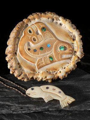 Antler Killer Whale Belt Buckle AND Walrus Ivory Seal Pendant