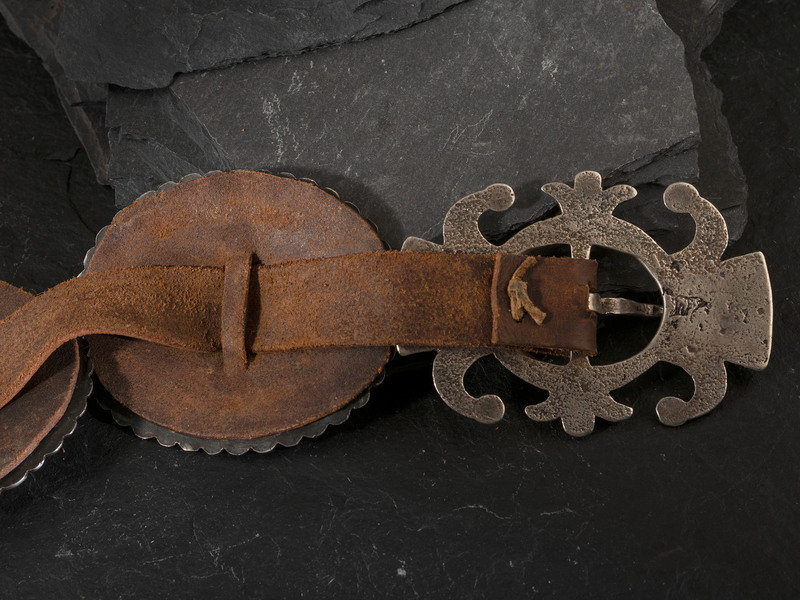 eight ovular conchas with scalloped edges, decorated with stamped and chiseled designs; along with a sandcast buckle; not marked