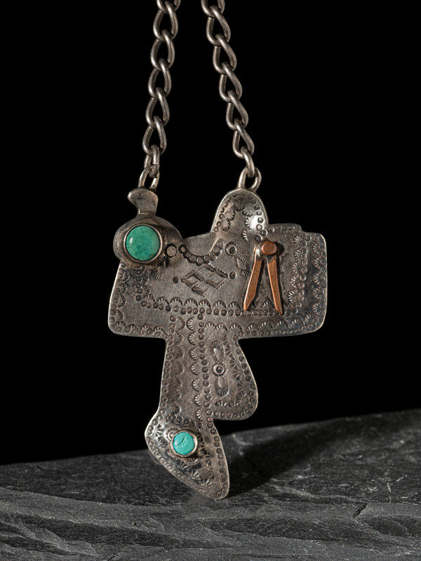 Fred Harvey Era Stamped Silver Saddle Watch Fob, with Turquoise and Copper Accents