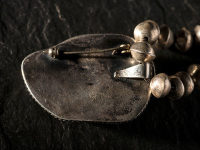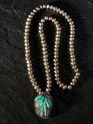 Silver and Carved Turquoise Leaf Pendant / Pin, with Silver Bead Necklace