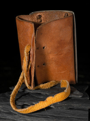 concha length 4-1/8 inches x width 2-7/8 inches, leather length 8 inches x width 4-1/8 inches, total combined weight 81.4 dwt.