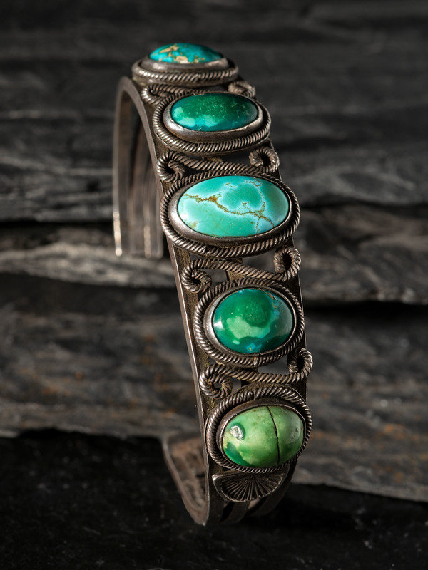 set with a row of five graduated turquoise cabochons; not marked