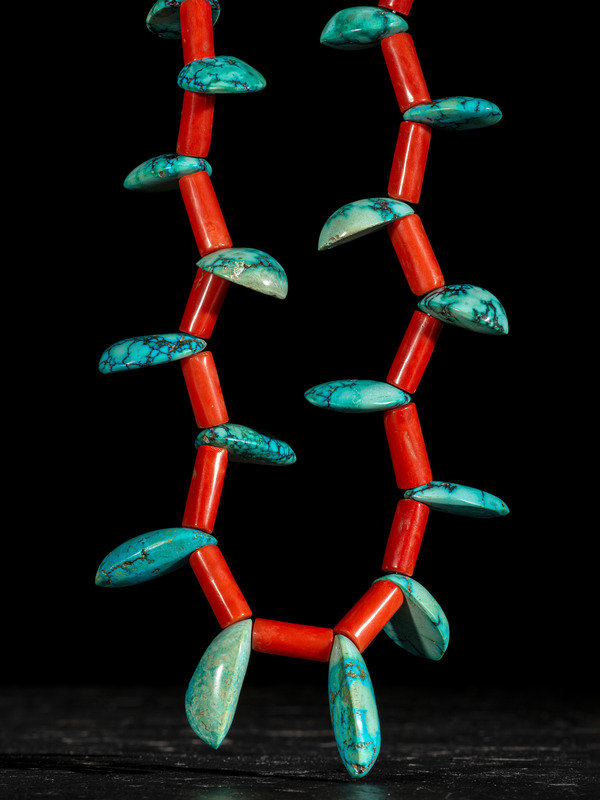 single-strand necklace with traditional cord wrapping, strung with graduating luminous gem quality turquoise tabs alternating with graduated coral beads; not marked